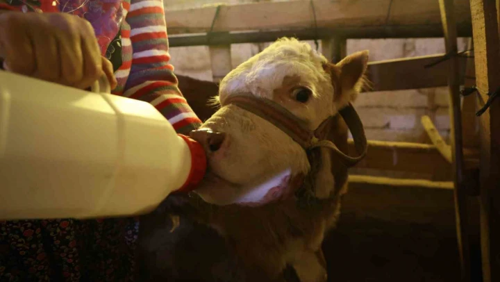 Elazığ'ın Sugözü Mahallesi'nde hayvancılıkla geçimini sağlayan İlhan Cömert'in büyükbaş hayvanı doğum yaparken öldü. Yeni doğan buzağıyı ilk başlarda soğuktan üşümesin diye evinde besleyen Cömert, bir süre sonra büyükbaş hayvanlarının bulunduğu ahıra aldı. Buzağıyı kendi çocuklarından ayırt etmeyen aile, sabah uyanır uyanmaz kendi hayvanlarından sağdıkları sütü buzağıya içirdikten sonra tımarını yapıyor. İlhan Cömert, buzağı kendini toparlayana kadar elleriyle besleyeceklerini belirtti. Cömert, 'Bir ay önce buzağımızın annesi doğarken öldü. Biberonla besliyoruz. Hayvan elimizde ölmesin diye diğer hayvanlardan sağdığımız ve dışarıdan aldığımız sütle besliyoruz. Sabah kalktığımızda 3 çocuğum var, buzağıyı da bizim çocuklarımızın yerine koymuşuz. Sabah hemen koşup karnını doyuruyoruz. Sütünü verip tımarını yapıyoruz. Hayvancılığı seviyoruz ama zorlukları da çok fazla. Onu görmesek olmuyor. Buzağı bizim maskotumuz oldu' dedi.