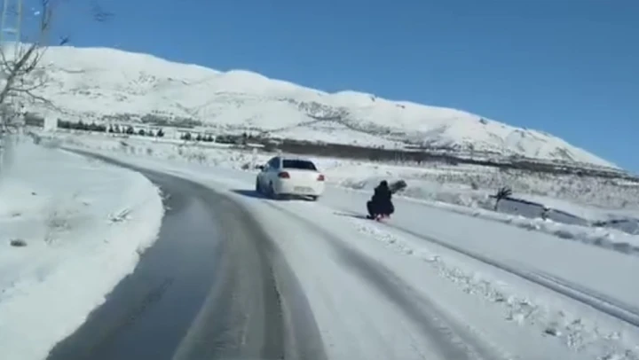 Araca bağladığı kızağı metrelerce çekti