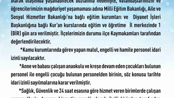 Elazığ Valiliği'nden yapılan açıklamada, '13 Ocak 2026 Salı günü ilimizde beklenen yoğun kar yağışı ve buna bağlı olarak ulaşımda yaşanabilecek buzlanma nedeniyle, vatandaşlarımızın ve öğrencilerimizin mağduriyet yaşamaması adına Milli Eğitim Bakanlığı, Aile ve Sosyal Hizmetler Bakanlığı'na bağlı eğitim kurumları ve Diyanet İşleri Başkanlığı'na bağlı Kur'an kurslarında eğitim ve öğretime il merkezinde 1 gün ara verilmiştir. İlçelerimizin durumu ilçe Kaymakamları tarafından değerlendirilecektir. Kamu kurumlarında görev yapan malul, engelli ve hamile personel idari izinli sayılacaktır. Anne ve babası çalışan anaokulu ve kre?e devam eden çocukları bulunan personel ile engelli çocuğu bulunan personelden birinin, söz konusu tarihte idari izinli sayılmalarına karar verilmiştir. Sağlık, güvenlik ve 24 saat esasına göre hizmet veren birimlerde çalışan personellerin durumu hizmetin gereği olarak ilgili birimler tarafından değerlendirilecektir' denildi.