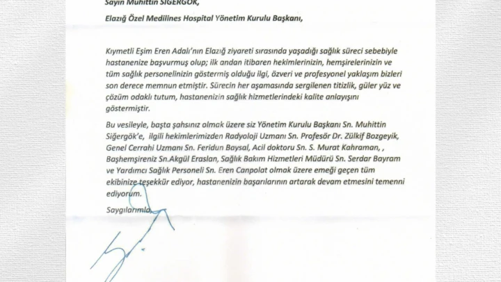 Medilines Hospital yönetimi tarafından yapılan açıklamada, Serdal Adalı'nın takdir dolu ifadelerinin tüm sağlık çalışanları için önemli bir motivasyon kaynağı olduğu belirtilerek, etik değerlere bağlı, hasta güvenliğini önceleyen ve insanı merkeze alan sağlık hizmeti anlayışıyla Elazığ ve bölge halkına hizmet vermeye aynı kararlılıkla devam edileceği ifade edildi.