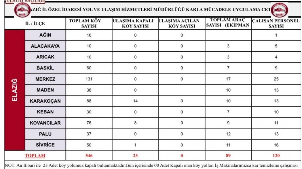 Elazığ’ın yüksek kesimlerinde etkili olan kar yağışı nedeniyle 23 köy yolu ulaşıma kapandı. Elazığ İl Özel İdaresi ekipleri, 89 araç ve 120 personelle kapalı yolların açılması için çalışmalarını sürdürüyor.