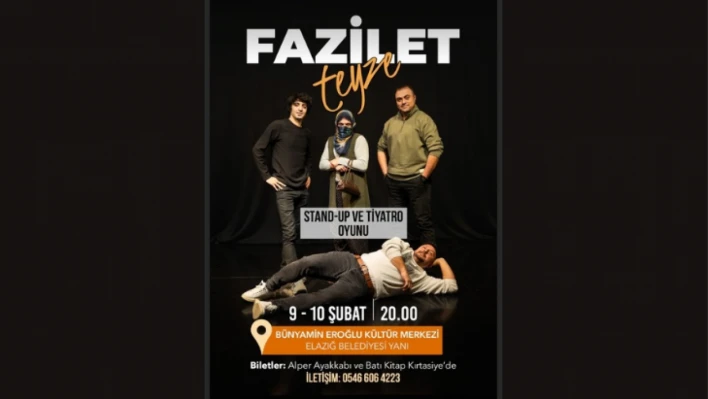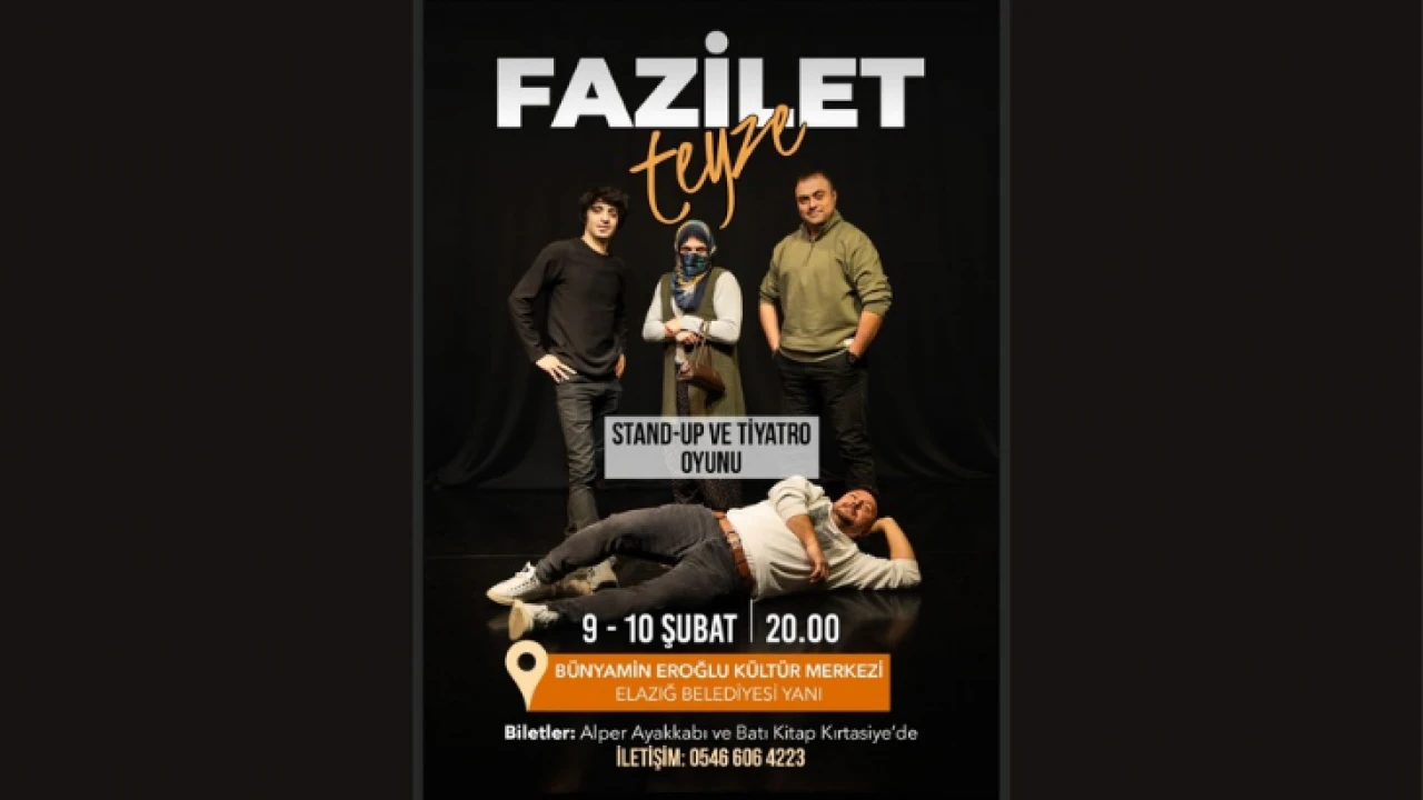 Stand-up ve tiyatroyu bir araya getiren 'Fazilet Teyze' adlı oyun, Elazığlı sanatseverlerle buluşmaya hazırlanıyor. Mizah dolu anlatımı ve sahnedeki enerjik performanslarıyla dikkat çeken oyun, 9-10 Şubat tarihlerinde saat 20.00'de sahnelenecek.