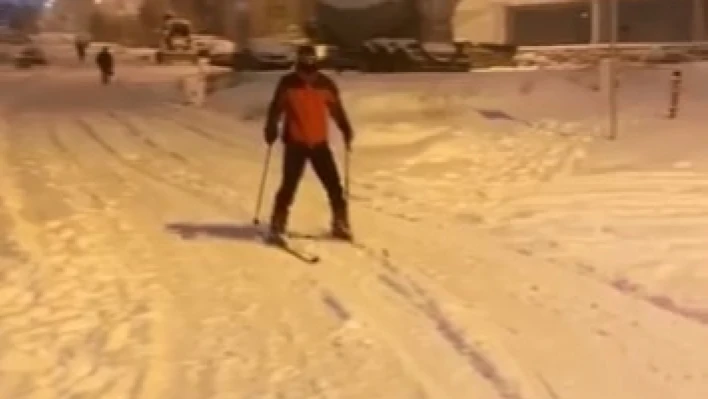 Elazığ'da bir vatandaş, yağan kar sonrası kayak takımıyla caddede gezdi.